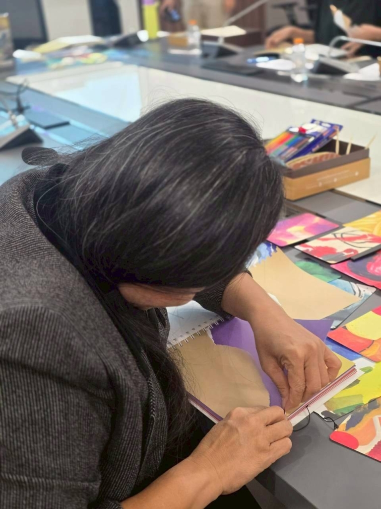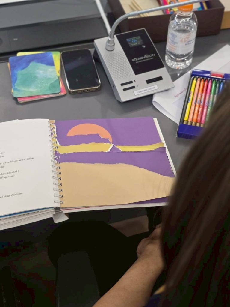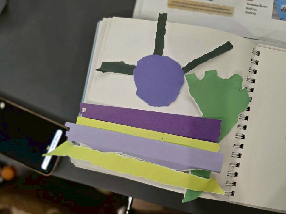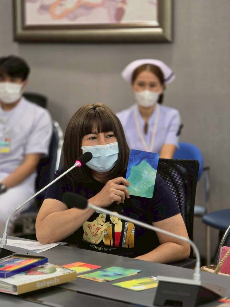 กิจกรรมในครั้งนี้เป็นส่วนหนึ่งจากในเล่ม “ชุดศิลปะดูแลใจ” ชื่อว่า “ฉีกสร้างรูป” ซึ่งเปิดโอกาสให้ผู้ป่วยได้ สร้างงานศิลปะ ด้วยการฉีกหน้ากระดาษในเล่ม และนำเศษกระดาษที่ฉีกออกมา มาสร้างเป็นงานศิลปะของตัวเองได้อีก โดยไม่ต้องยึดติดกับความสวยงามหรือความสมบูรณ์แบบ เพราะทุกเศษที่ฉีก คือชิ้นส่วนของอารมณ์ความรู้สึก…ที่เมื่อถูกวางอย่างตั้งใจ ก็กลายเป็นภาพที่มีความหมาย
