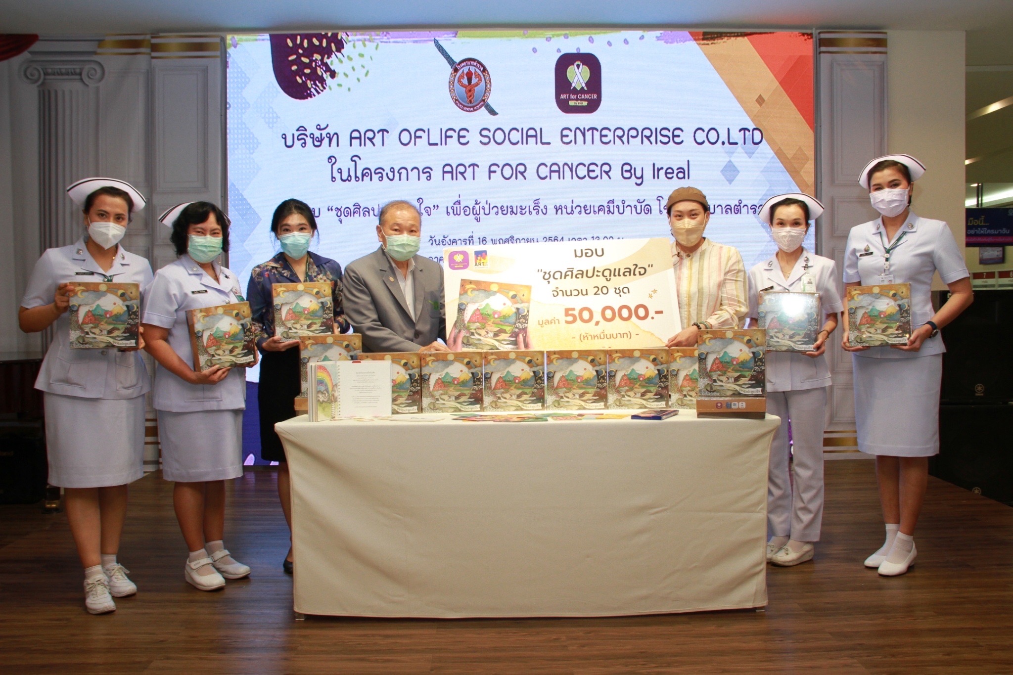วันที่ 16 พ.ย. 64 อาร์ต ฟอร์ แคนเซอร์ บาย ไอรีล ภายใต้บริษัทอาร์ต ออฟ ไลฟ์ วิสาหกิจเพื่อสังคม จำกัด นำโดย ไอรีล ไตรสารศรี ผู้ก่อตั้งองค์กรได้มอบ จำนวน 20 กล่อง (รวมมูลค่า 50,000 บาท) ให้กับ พล.ต.ต.ทรงชัย สิมะโรจน์ ผู้ก่อตั้ง หน่วยเคมีบำบัด, พ.ต.อ.หญิง ชิดชไม พยาน้อย หัวหน้าสายงานการพยาบาลอายุกรรม1,พ.ต.อ.หญิง ณปภัช ทบวัล หัวหน้าหน่วยเคมีบำบัด พร้อมด้วยคณะพยาบาลจากหน่วยเคมีบำบัด ณ โรงพยาบาลตำรวจ